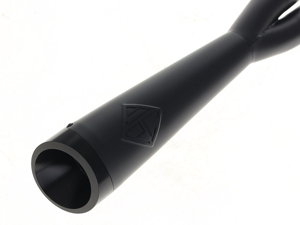 * 4″ rolled cone muffler with a 2 ¼ coiled perforated baffle for increased torque and a deep tone