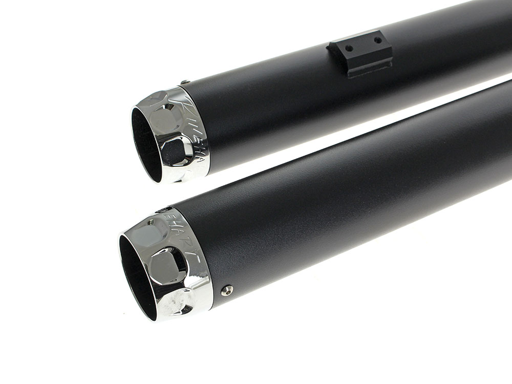 3in. Slip-On Mufflers – Black with Chrome Scalloped End Caps. Fits Softail Deuce 2007 & Fat Boy 2007-2017