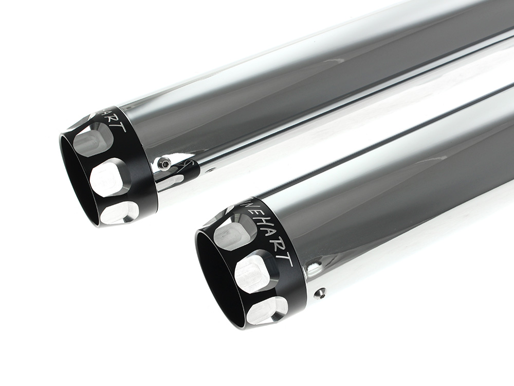 3in. Slip-On Mufflers – Chrome with Black Scalloped End Caps. Fits Softail Deluxe 2007-2017, Blackline 2012-2013, Softail Slim 2013-2017, Cross Bones 2008-2011 & Fat Boy S 2016-2017