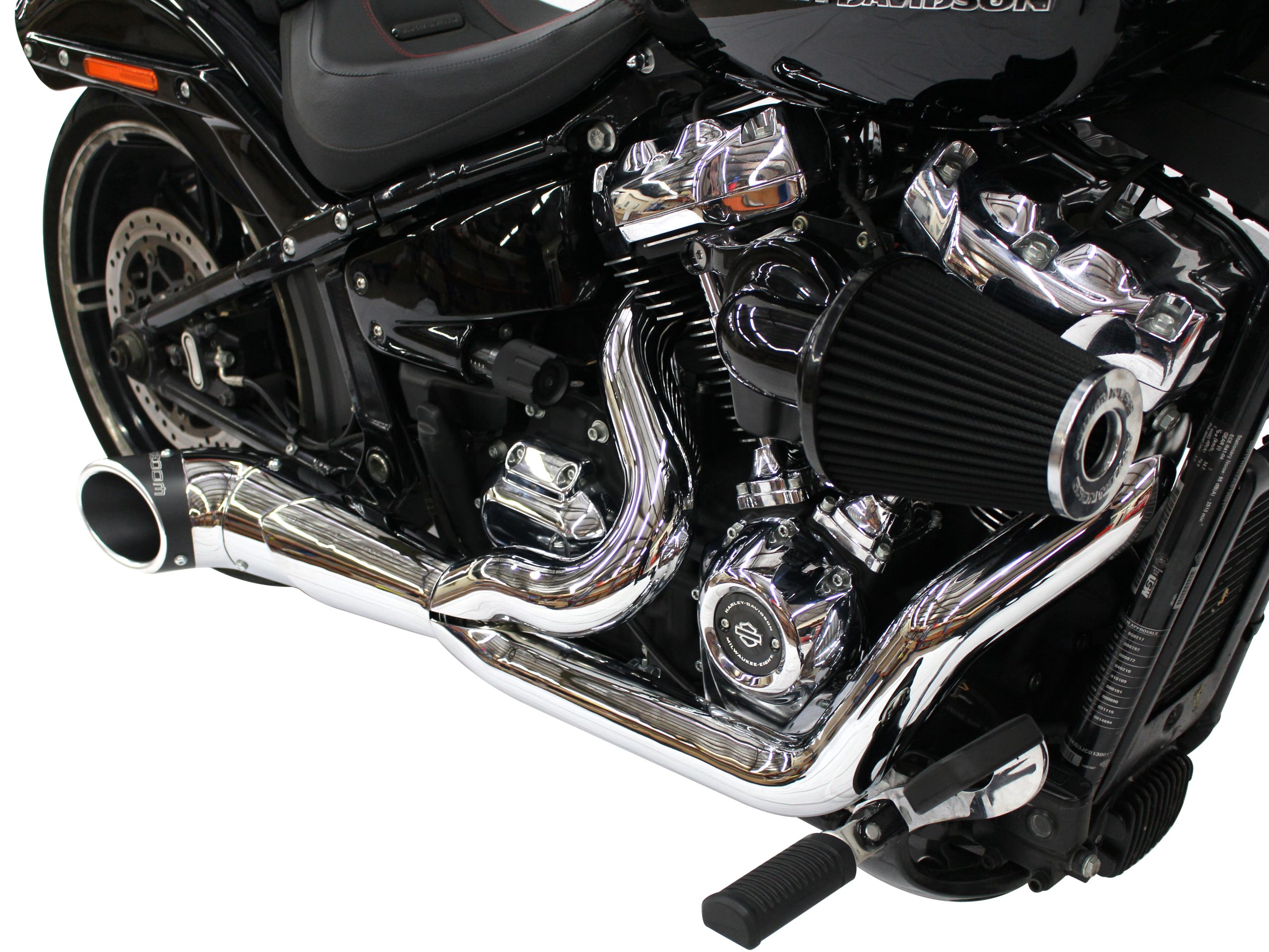 Turnout 2-into-1 Exhaust – Chrome with Black End Cap. Fits Softail 2018up.